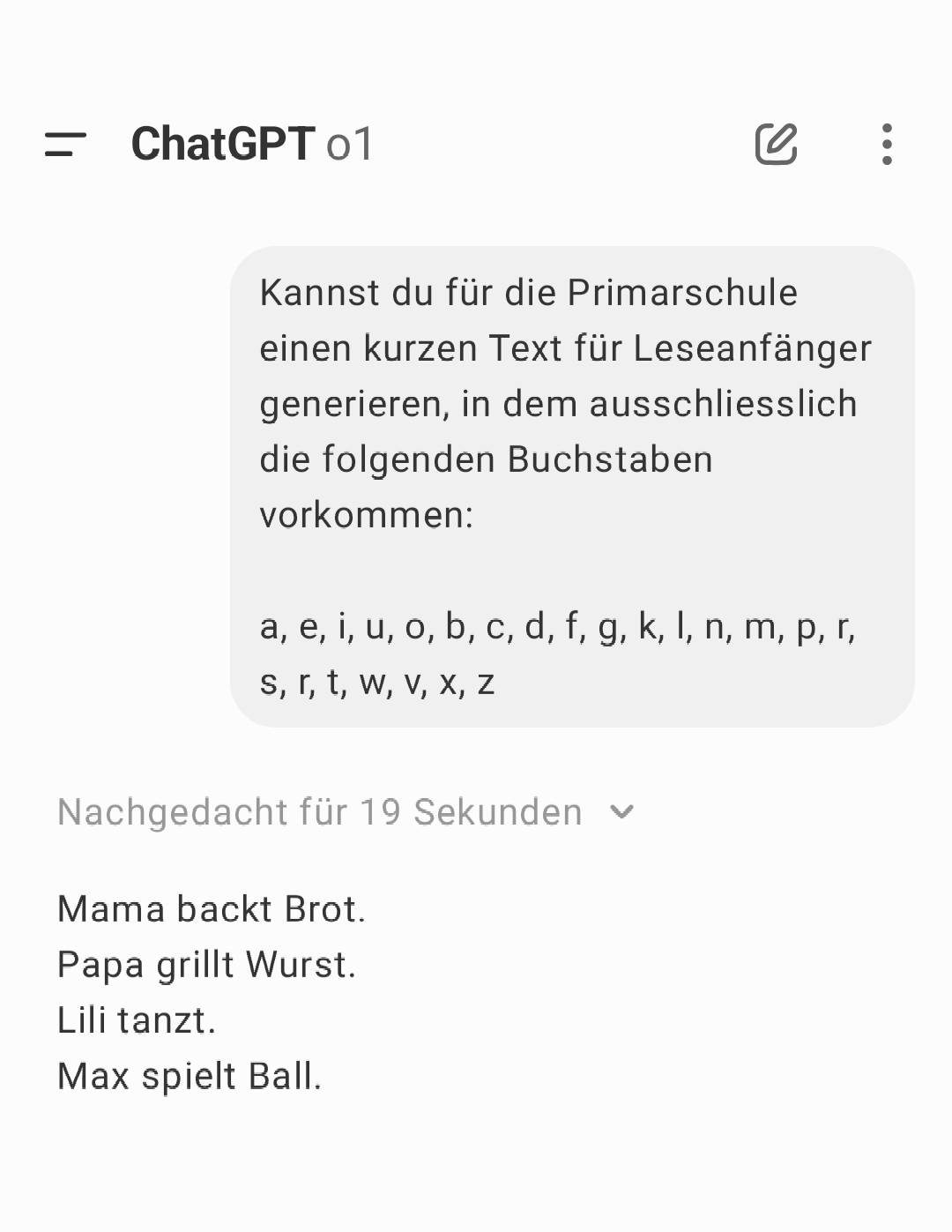 Hallo, einige grundschullehrer überlegen, ob du aus vorgebenen Buchstaben einen Text für Leseanfänger basteln kannst, in dem nur diese Buchstaben vorkommen. Wollen wir das mal testen?
