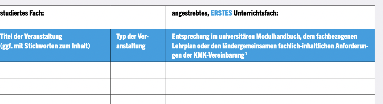 Du schreibst rechts rein, was deines Erachtens aus den Modulhandbüchern für z.B. Mathematik (Lehramtsstudium der passenden Schulart) zu Kurs X aus deinem z.B. Diplom- Physikstudium oder was für einen Abschluss du auch haben magst passt, um eine mögliche Anerkennung inhaltlich zu rechtfertigen. Je sauberer du da vorarbeitest, desto einfacher ist die Anerkennung. Je mehr du von irgendeiner Behörde erwartest an deiner Stelle herauszusuchen und abzugleichen, desto höher die Chance, dass etwas Anerkennbares übersehen wird, weil jemand schlicht keine Ahnung von deinen Fächern hat.