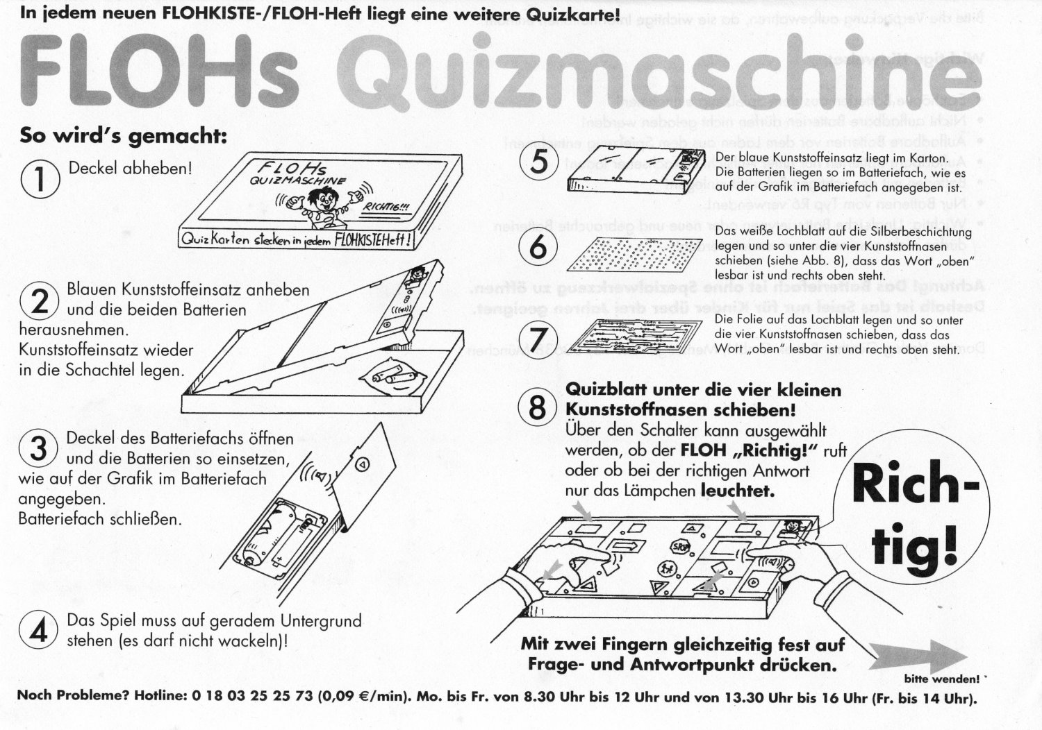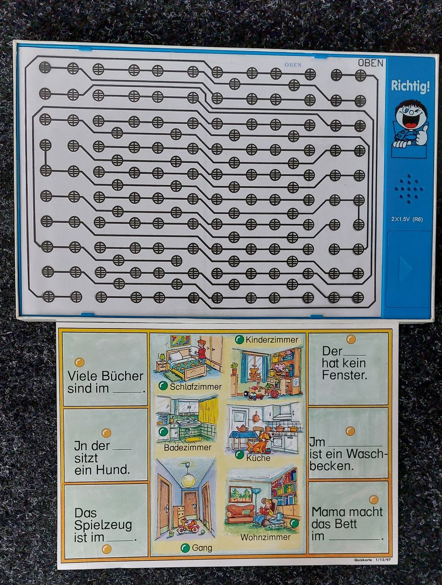 Die Zeitschrift Flohkiste gibt es nicht mehr, aber diese "Maschinen" funktionieren noch: Ich verkaufe 3 "Quizmaschinen", die tun's noch alle rrrrrrrrrrrrrrichtig. Eine neuere kann man sogar umschalten, vom (auf Dauer nervigen) Ton- auf Lichtsignal. Zum Betrieb werden 2 x 1,5Volt (AA) Batterien benötigt.