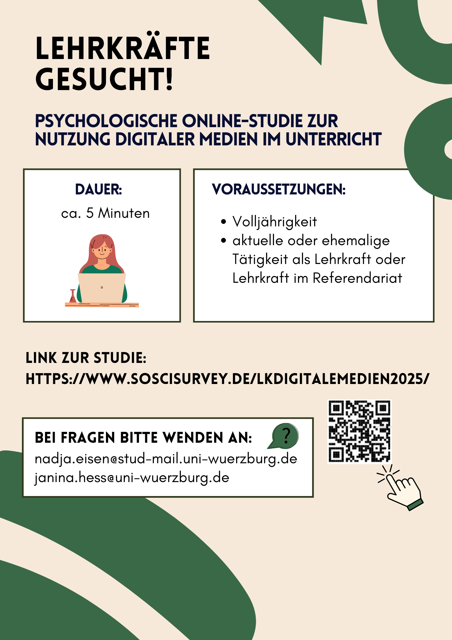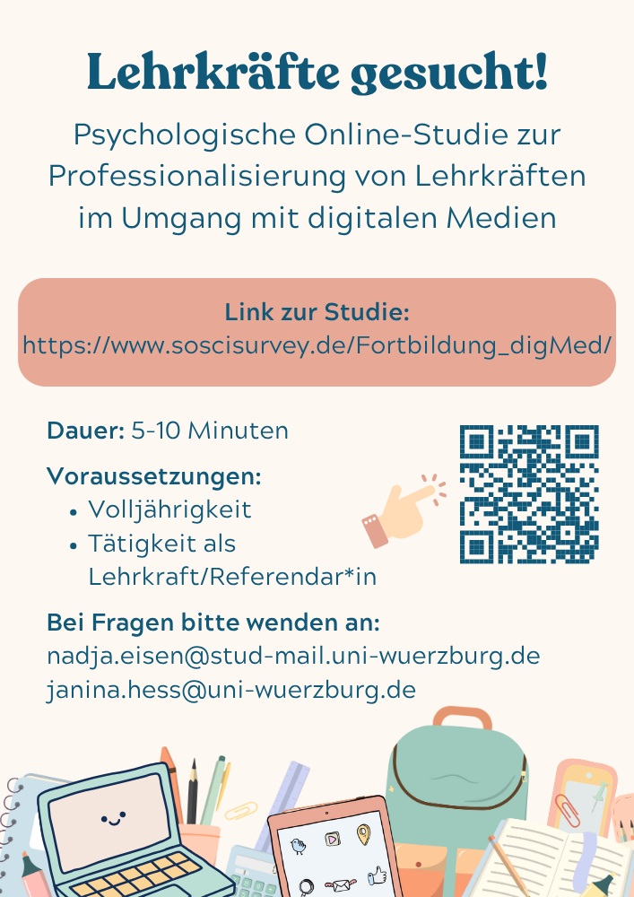 im Rahmen meiner Projektarbeit im Master-Studium der Psychologie an der Universität Würzburg führe ich eine Online-Umfrage zur Nutzung digitaler Medien im Unterricht unter Lehrkräften an Schulen durch und würde mich freuen, wenn Sie mich dabei unterstützen! Es spielt dabei keine Rolle, welche Schulform und Unterrichtsfächer Sie unterrichten. Voraussetzung ist lediglich, dass Sie volljährig sind und entweder aktuell als Lehrkraft tätig sind oder dies in der Vergangenheit waren. Auch Referendarinnen und Referendare sind herzlich eingeladen, an der Umfrage teilzunehmen.