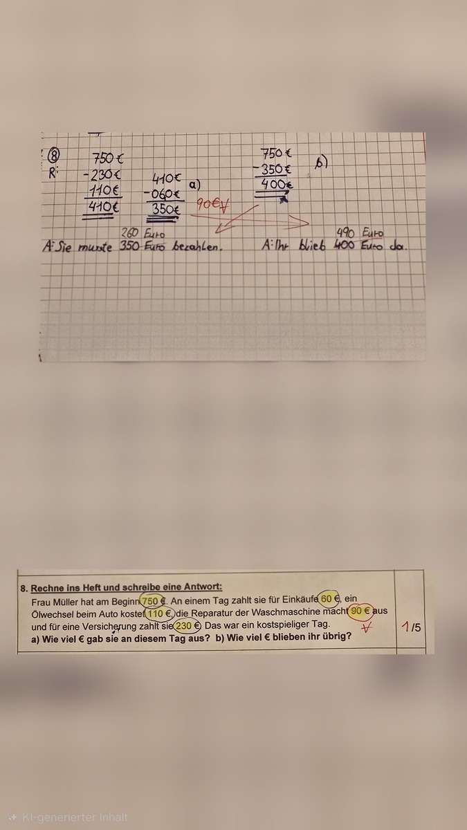 Die Schülerlösung passt allerdings auch nicht, weder zu der vermutlich erwarteten Lösung noch zu dem, was die Aufgabe sprachlich wirklich beschreibt. Die Antwortsätze mit den zwei 'Ergebnisangeboten' bekämen bei mir auch keine Punkte. Der Punkteansatz mit 5 Punkten ist mir etwas unklar, bei mir hätte es den einen Punkt für die richtige Erkenntnis gegeben, dass der Restbetrag (Aufgabenteil b) sich aus der Differenz von Anfangsbetrag und Ausgabe ergibt. Selbst wenn dort mit einem Folgefehler gerechnet wurde. Rechnung a enthält, dann neben der sachlichen Unvollständigkeit auch noch Notationsfehler (fehlendes Minuszeichen, sowie Übertrag an falscher Stelle).
