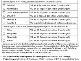 • Ich suche die Liste der Infektionskrankheiten, bei denen man nach Auftreten nicht zur Schule darf. Bzw. Dauer bis zur Wiederzulassung. Die Googlesuche hat nicht zum Erfolg geführt. Kann mir jemand helfen?