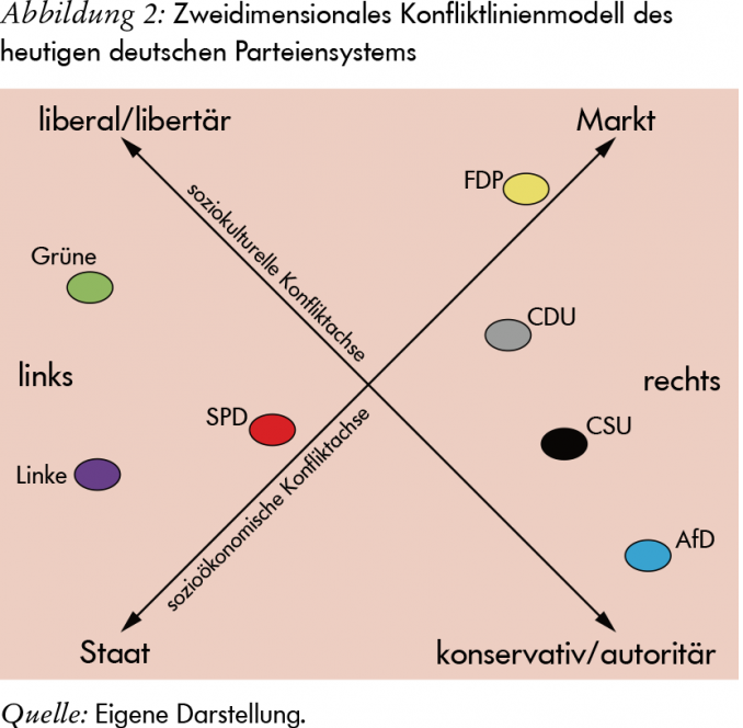 • Die Abbildung ist aus dem Jahr 2018. Für eine grobe Orientierung ist sie ganz gut. Die Linken wären wohl inzwischen auf der soziokulturellen Konfliktachse deutlich weiter Richtung liberal/libertär, eher noch hinter den Grünen, einzuordnen. Die CDU auf der sozioökonomischen Konfliktachse wiederum weiter Richtung Staat. Ich überlege, ob die Positionierung der FDP in der Abbildung so noch passend ist oder ob das BSW diese Position inzwischen eingenommen hat.