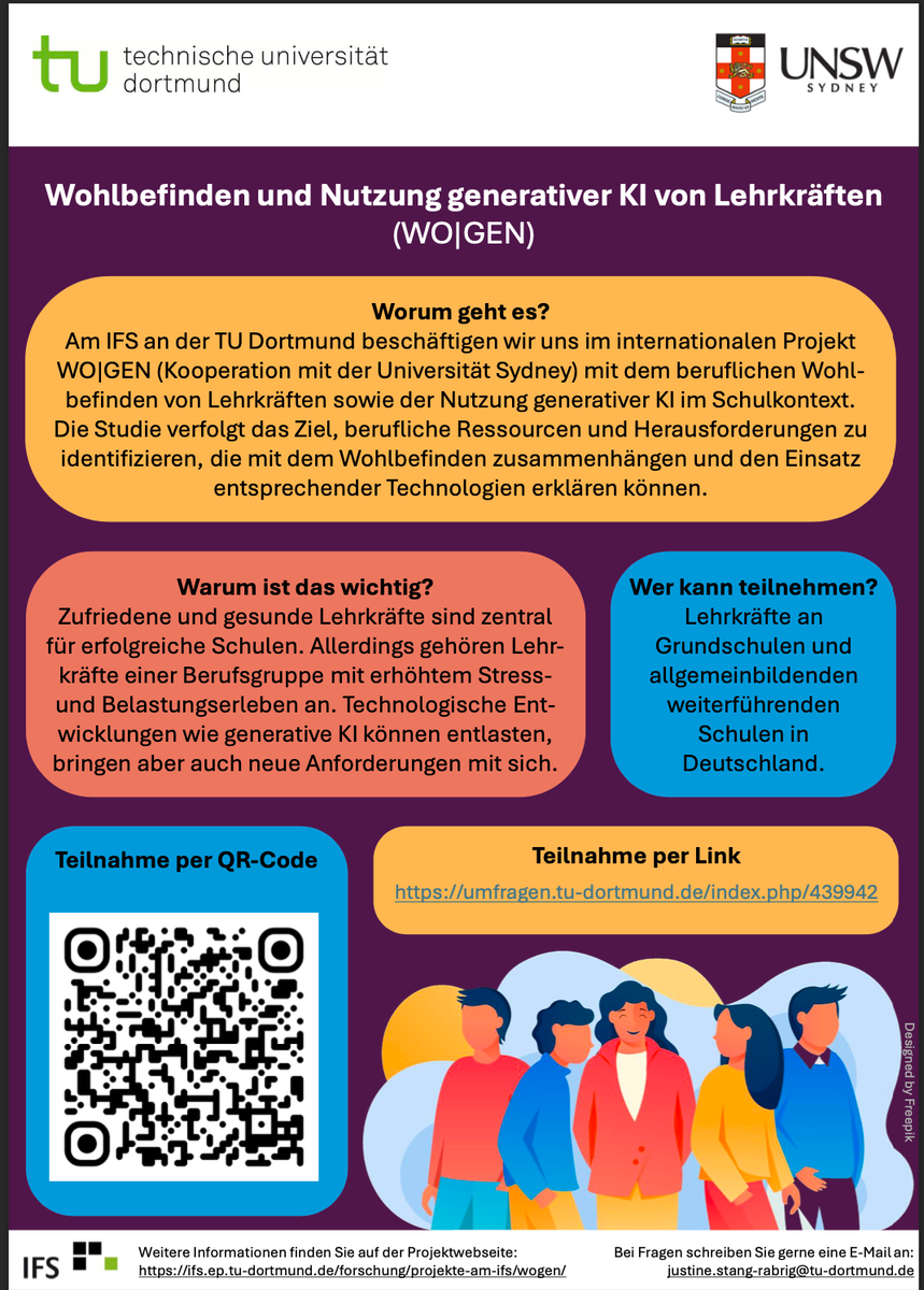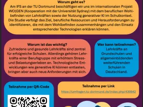 im meiner Bachelorarbeit an der TU Dortmund beschäftige ich mich mit dem beruflichen Wohlbefinden, Ressourcen und Herausforderungen im Schulalltag sowie mit der Nutzung generativer KI von Lehrkräften. Meine Bachelorarbeit ist Teil der WO|GEN-Studie, die am Institut für Schulentwicklungsforschung (IFS, TU Dortmund) durchgeführt wird.