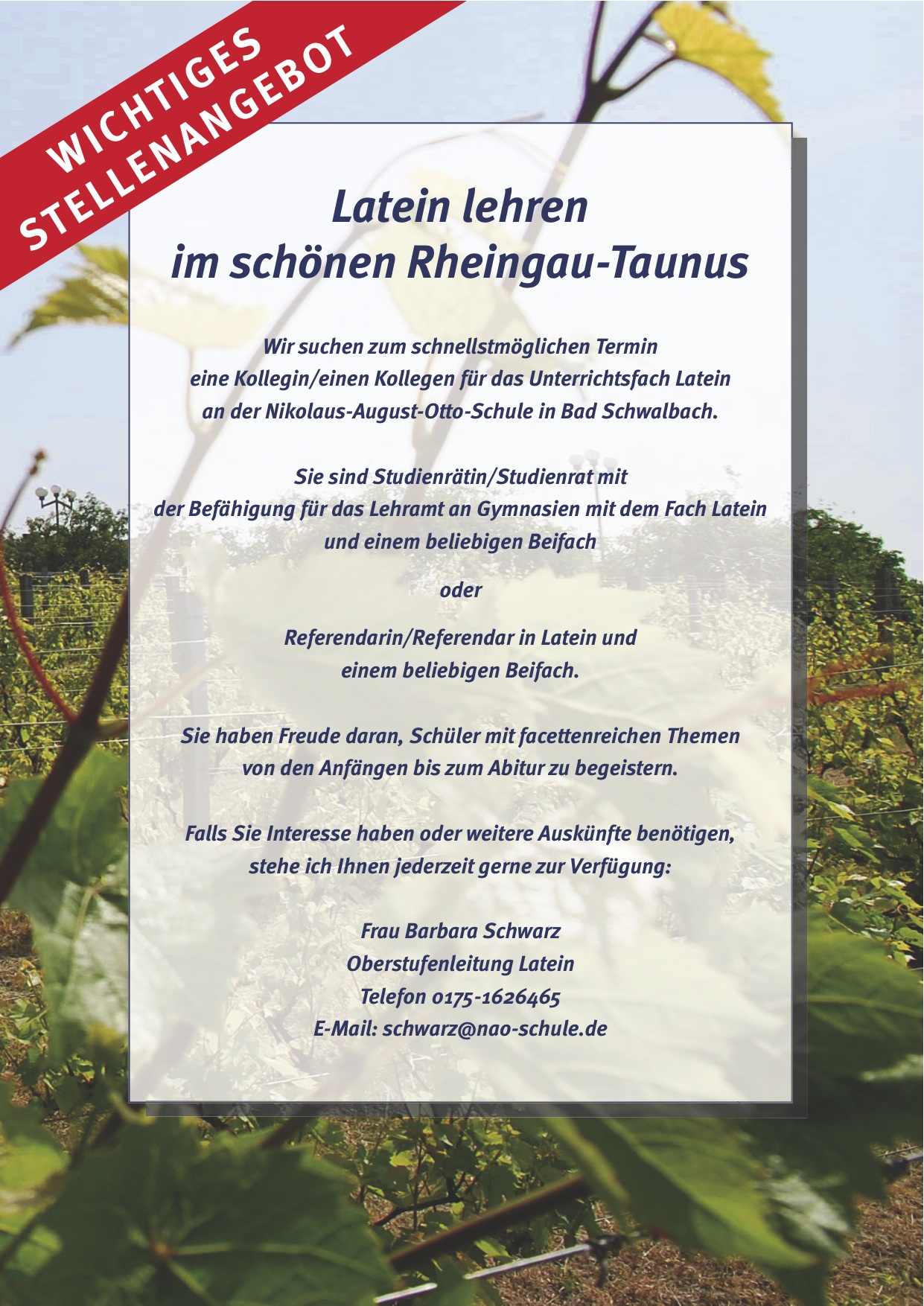 Wir suchen zum schnellstmoglichen Termin eine Kollegin/einen Kollegen fur das Unterrichtsfach Latein an der Nikolaus-August-Otto-Schule in Bad Schwalbach.