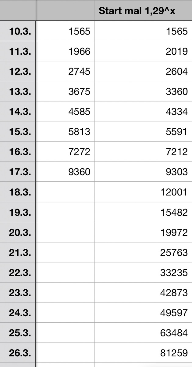 Ich rechne mit einem Wachstumsfaktor von 1,29. Mit Tag 0 am 10.3.