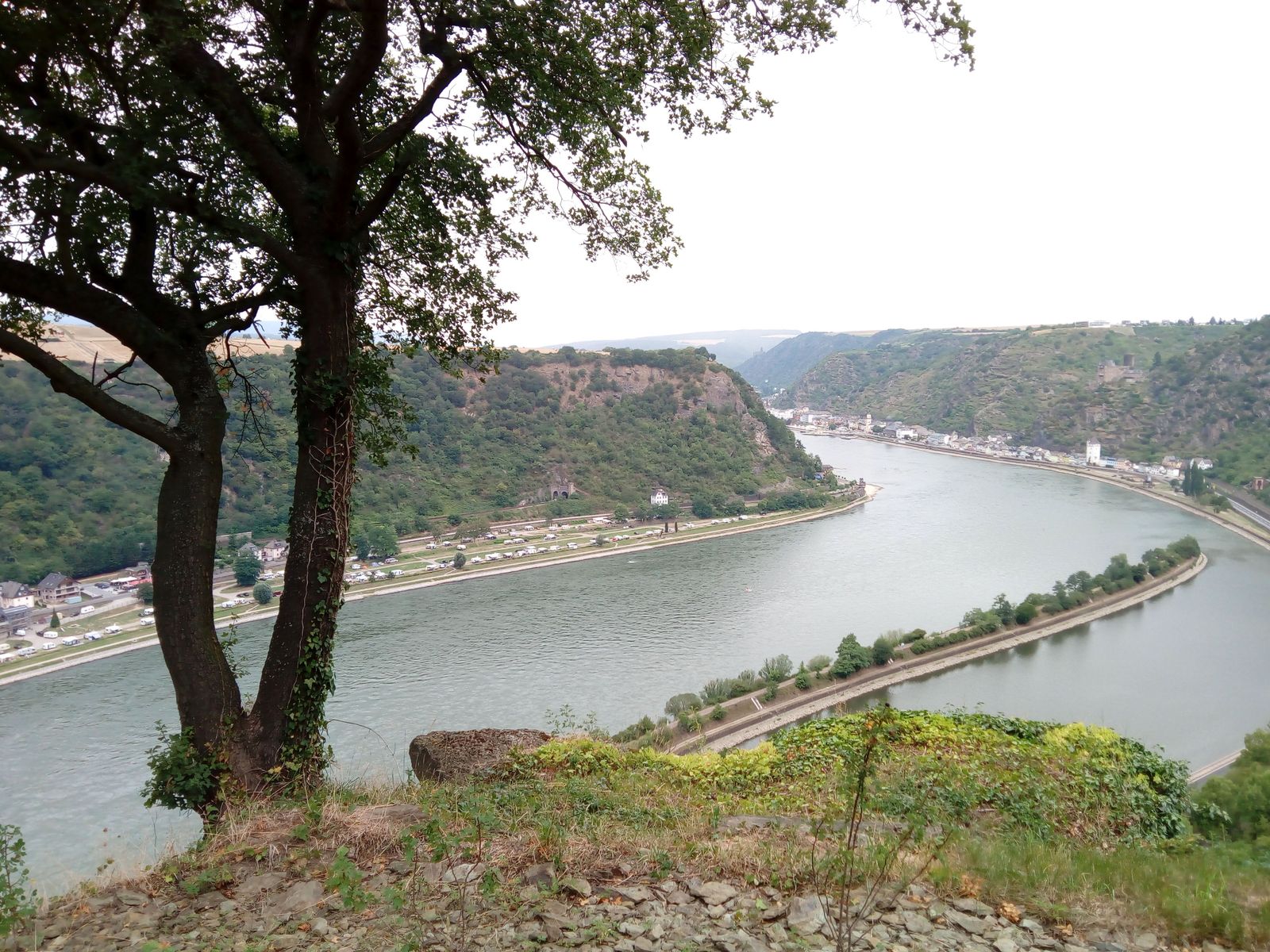 Das ist der Blick von der Loreley. Hinter der Kurve liegt St. Goar