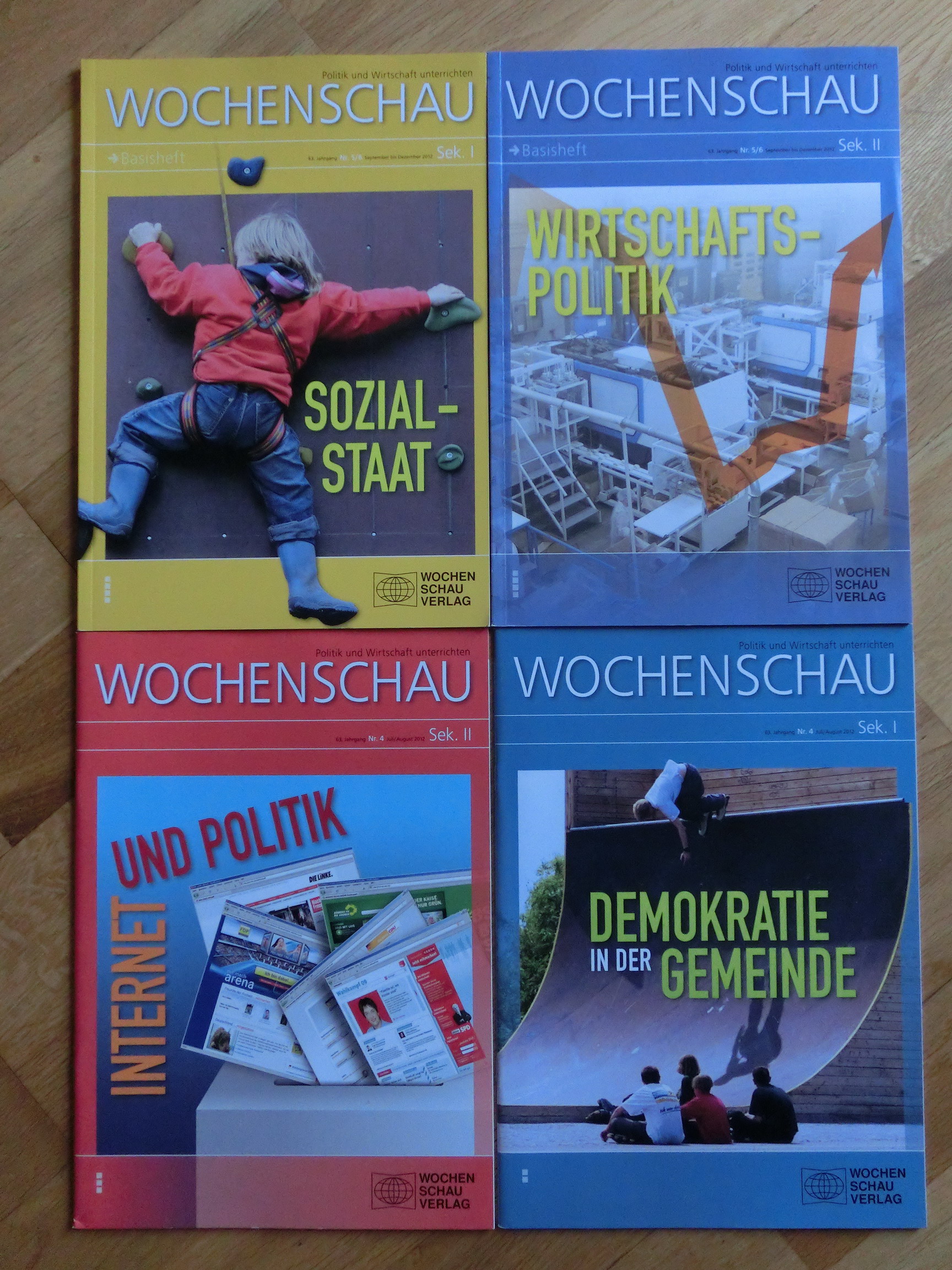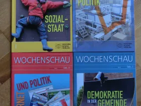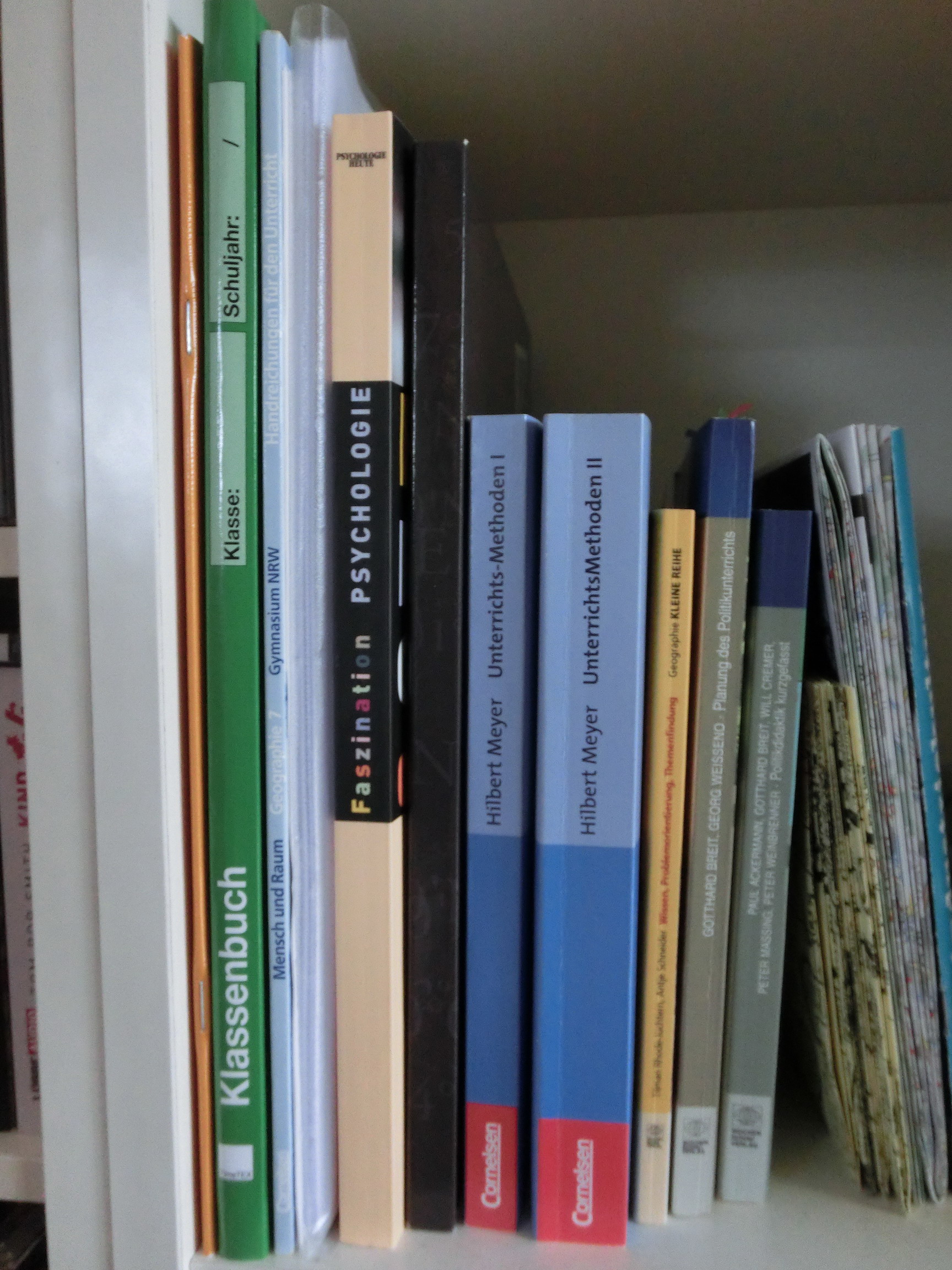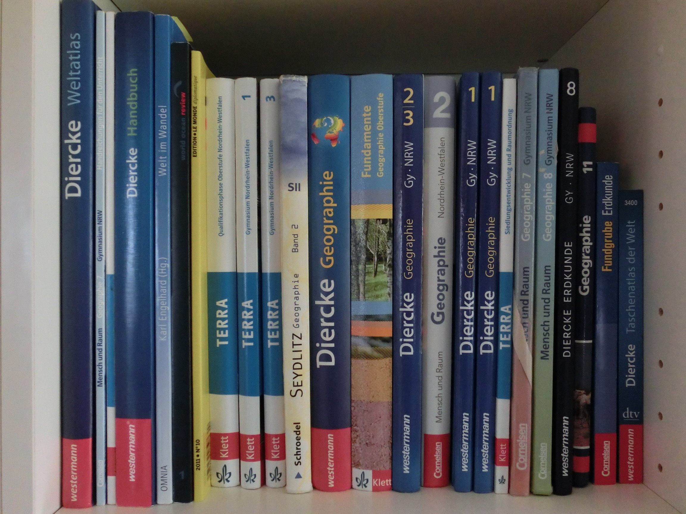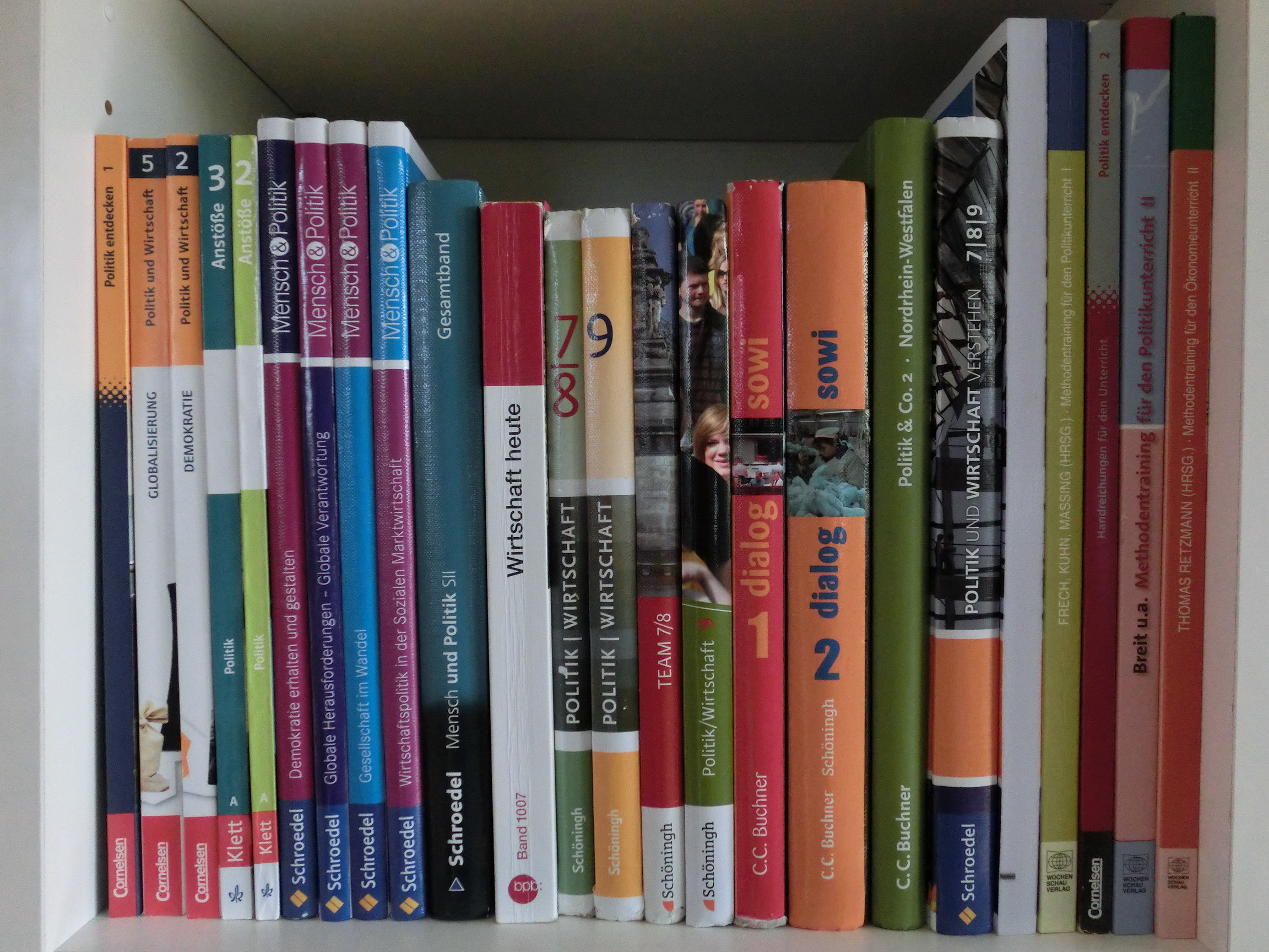 Fast alle fürs Gymnasium, viel Sek. 2 dabei, aber auch Unter- und Mittelstufenbücher, z.B. Terra, Diercke, Fundamente, Politik & Co., Mensch & Politik (neuste Ausgaben), Dialog Sowi, Wochenschau-Hefte, Politik und Wirtschaft (Cornelsen) Themenbände Oberstufe, dazu ein paar Grundsatzwerke wie z.B. die beiden Meyer-Bände zu Unterrichtsplanung.
