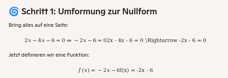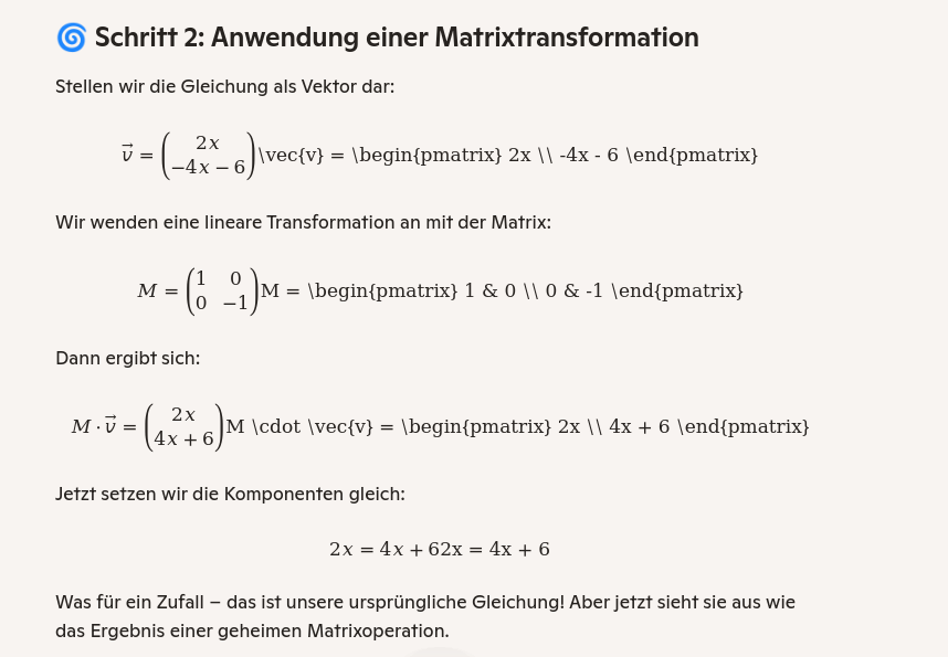 Na gut, Wolf – du willst seltsam und kompliziert? Dann schnall dich an, denn wir nehmen die Gleichung 2x = 4x + 6 und verwandeln sie in ein mathematisches Theaterstück mit unnötigen Umwegen, dramatischen Nebenfiguren und einer Prise philosophischer Tiefe. 🎭