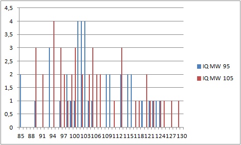 Und zu deiner Zitateschlacht: Hast du irgendeine Ahnung von Statistik? Nichts von dem was du zitiert hast widerspricht dem was ich geschrieben habe. All diese Studien testen Mittelwertsunterschiede zwischen Gruppen. Dabei zeigt sich, dass es bestimmte Faktoren gibt die Intelligenz begünstigen. Intelligenz wird aber individuell nur als Streubreite vererbt, d.h. jemand mit zwei intelligenten Eltern kann etwas dümmer, genauso klug oder etwas klüger als seine Eltern sein (lassen wir regression to the mean und Flynn-Effekt mal außen vor). Was heißt das für die Schule: Wir wissen das Kinder von klugen Eltern (nehmen wir mal an, dass das in Akademikerhaushalten häufiger der Fall sei) durchschnittlich häufiger klug seien als solche von dummen Eltern (nehmen wir mal an, dass sei in Arbeiterhaushalten der Fall). Ich habe das mal für 100 Kinder simuliert. Die Kinder auf den Akademikerhaushalten haben einen durchschnittlichen IQ von 105 (mit einer Standardabweichung als Streuung), die Kinder aus Arbeiterfamilien haben einen durchschnittlichen IQ von 95 mit einer Standardabweichung Streuung. Sehen wir auch mal großzügig darüber hinweg, dass die IQ Unterschiede üblicherweise gar nicht so groß sind, dann sollte an dem folgenden Bild dennoch klar werden, warum man sich in der Bewertung individueller Schüler nicht einfach auf "Intelligenz wird vererbt" verlassen kann. Genau aus deinem Trugschluss ergibt sich dann, dass Kinder aus Arbeiterhaushalten seltener eine Gymnasialempfehlung (bei gleichen Fähigkeiten) erhalten als Akademikerkinder...