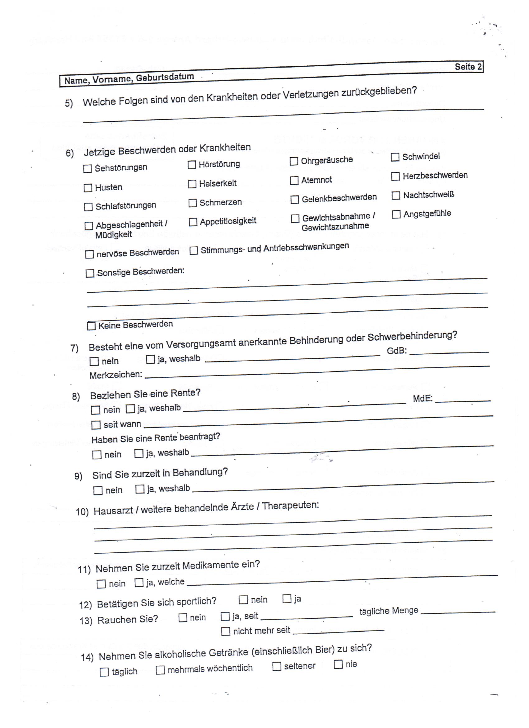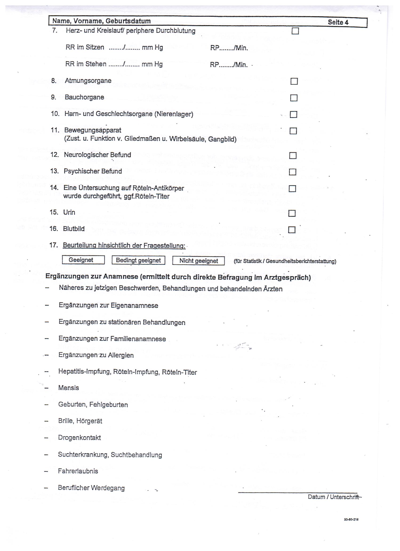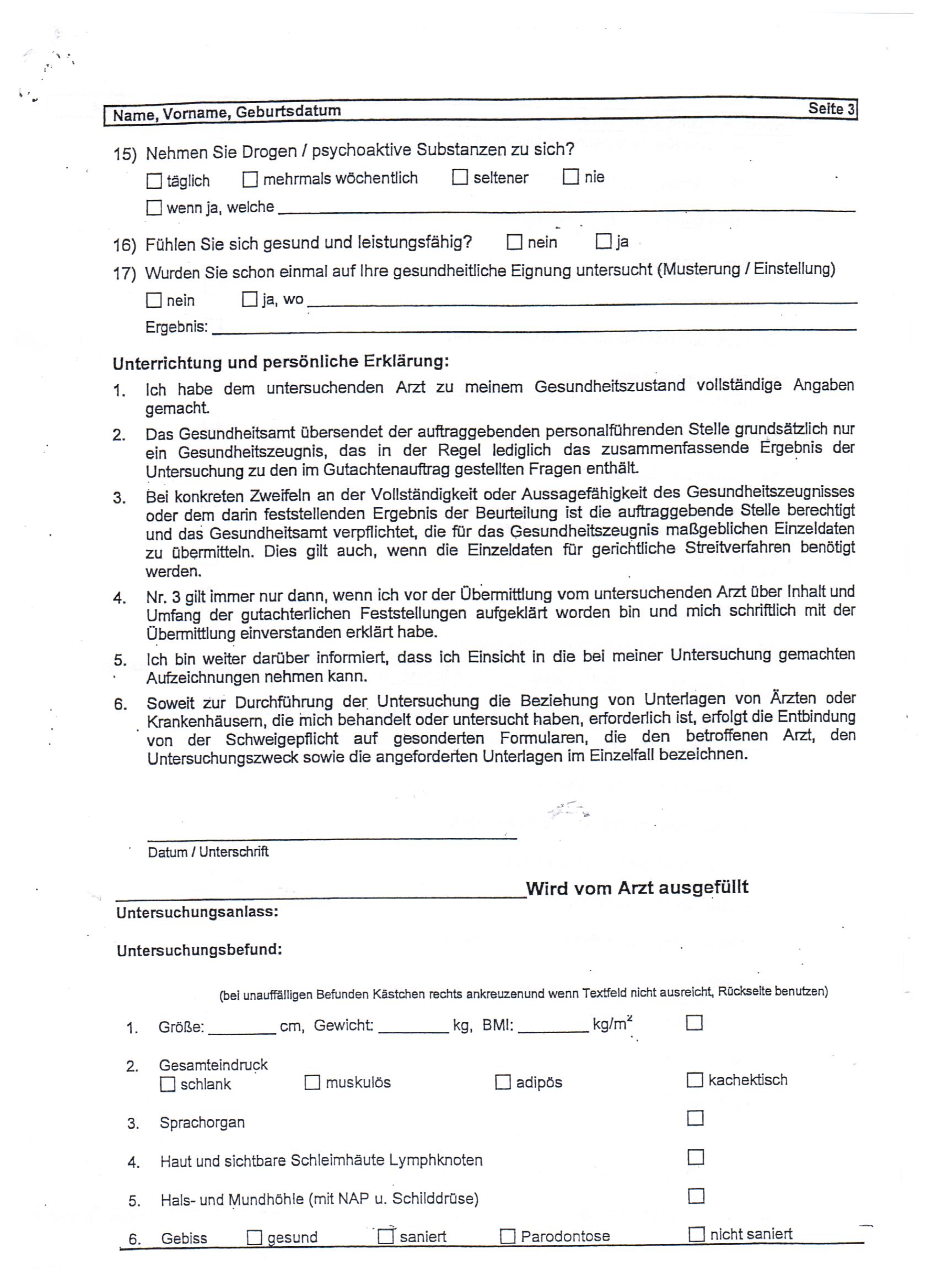 Nach Sehtest und Hörtest wurde insbesondere dieser Anamesebogen augefüllt. Die Amtsärztin hat mich gewogen, wollte meine Körpergröße wissen, hat dann noch auf meinem Bauch herumgedrückt und ließ mich im Liegen die Beine heben. Das wars.