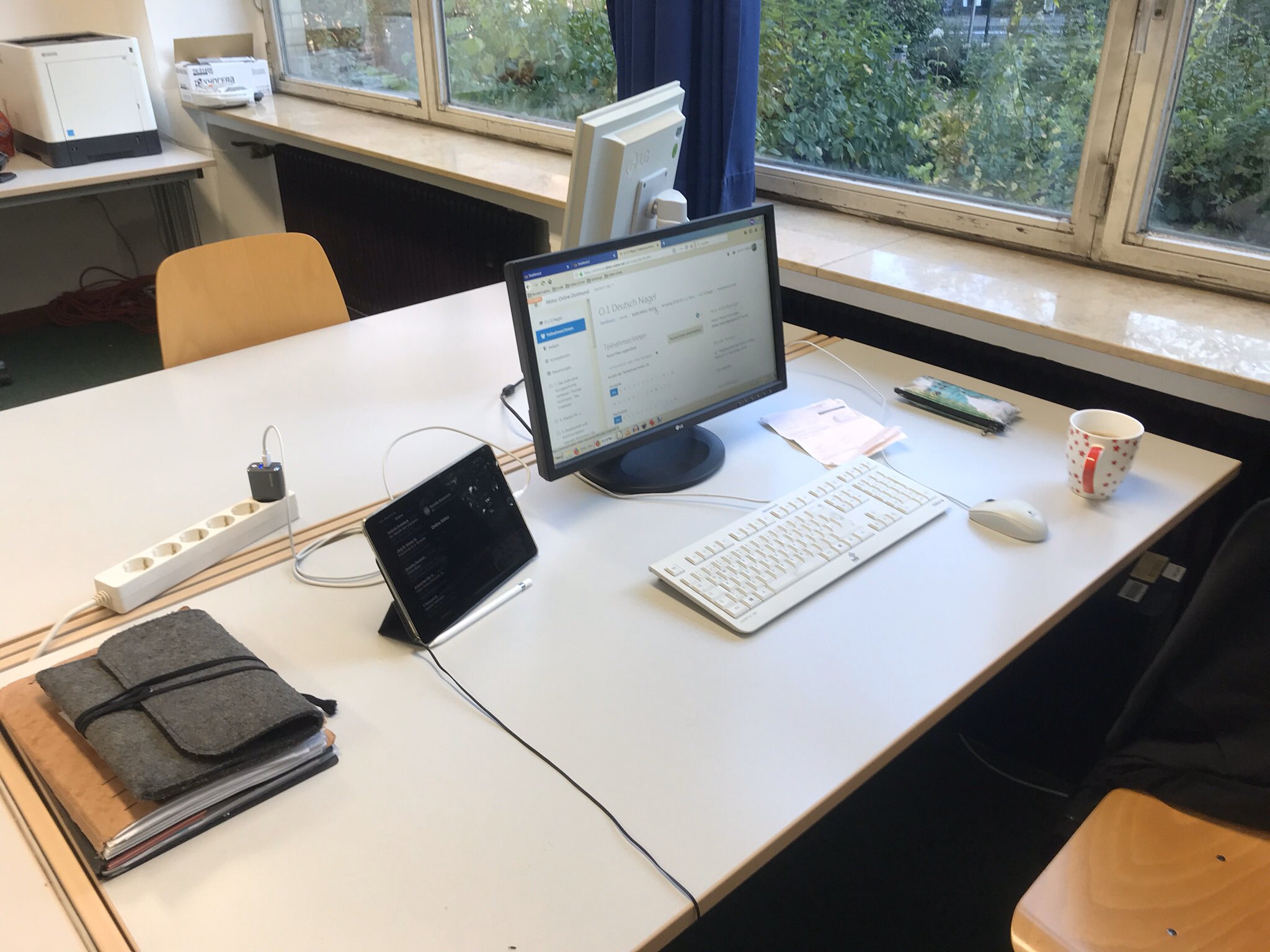 - Das ist nur deshalb so gut möglich, weil wir eine vernünftige Infrastruktur haben: schnelles WLan und Internet, Präsentationsboards, AppleTV, Aktivboxen in den Klassen. Für Schreibarbeiten (soweit möglich, s.u.) verwende ich eine Bluetooth-Tastatur, weil ich mit zehn Fingern schreibe und mir die in Schutzhüllen integrierte Tastaturen zu klein sind.