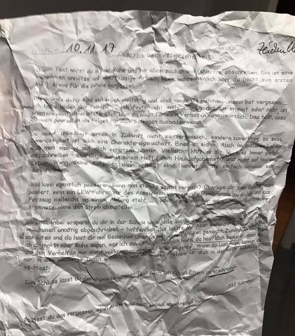 Doch eine Strafarbeit sollte er auch machen. Einmal alles abschreiben. Mein Mann und ich sind Strick dagegen das er etwas abschreiben soll für ein Zeichenblock der nicht am besagten Platz von den anderen Blöcken liegt. Deshalb hat mein Mann das Strafblatt zerknüttelt und will der Lehrerin ein Schreiben aufsetzen, das er nicht einsieht das unsere Sohn dies einmal abschreiben soll. Mein Sohn hat in der Klasse geweint( zu unrecht gefühlt) und die Lehrerin meinte in der Klasse vor allen: Da brauchst du auch nicht weinen. Da muss du beim nächsten Mal einfach dein Gehirn anstrengen. Wenn ein Kind schlampig ist und nix mit habt, soll es dazu zur Rechenschaft gezogen werden. Aber in dem Fall seh ich es anders. Da er immer sein Zeichenblock in der Schule lässt und Parallelklassen auch zu diesem Schrank/Regal Zugang haben.