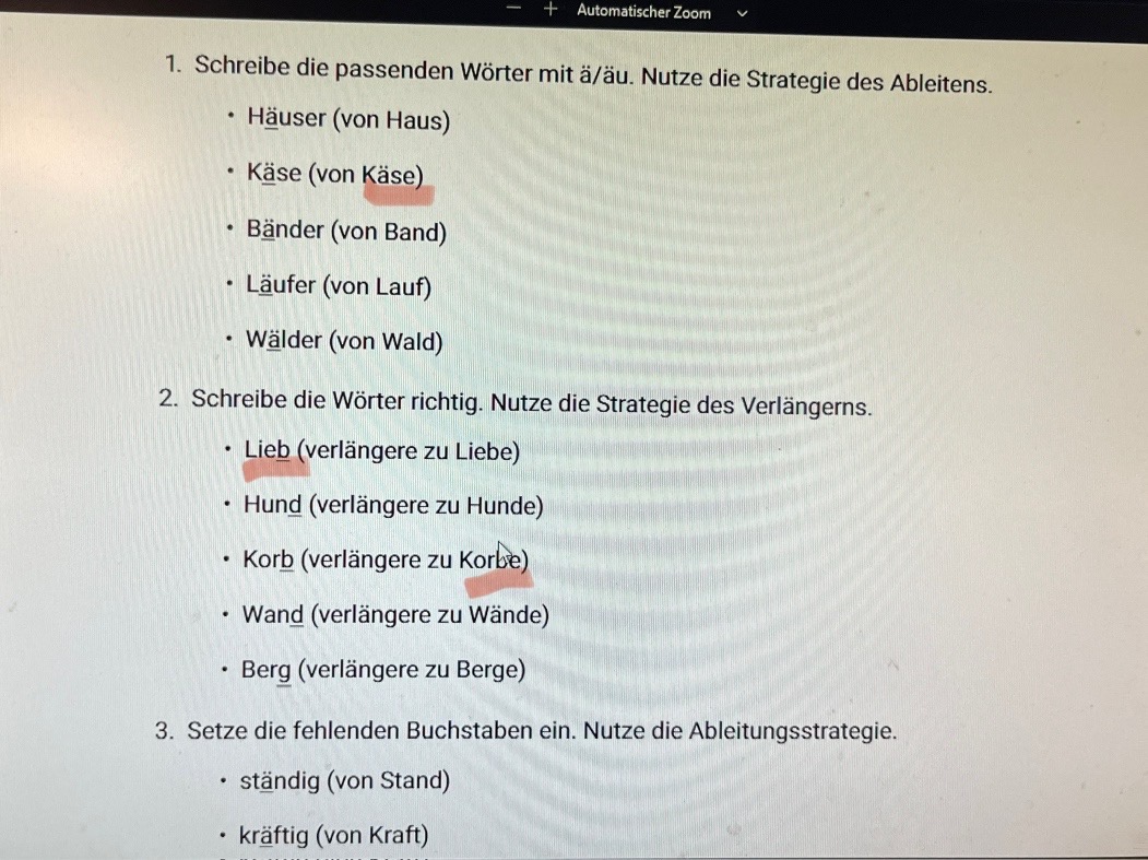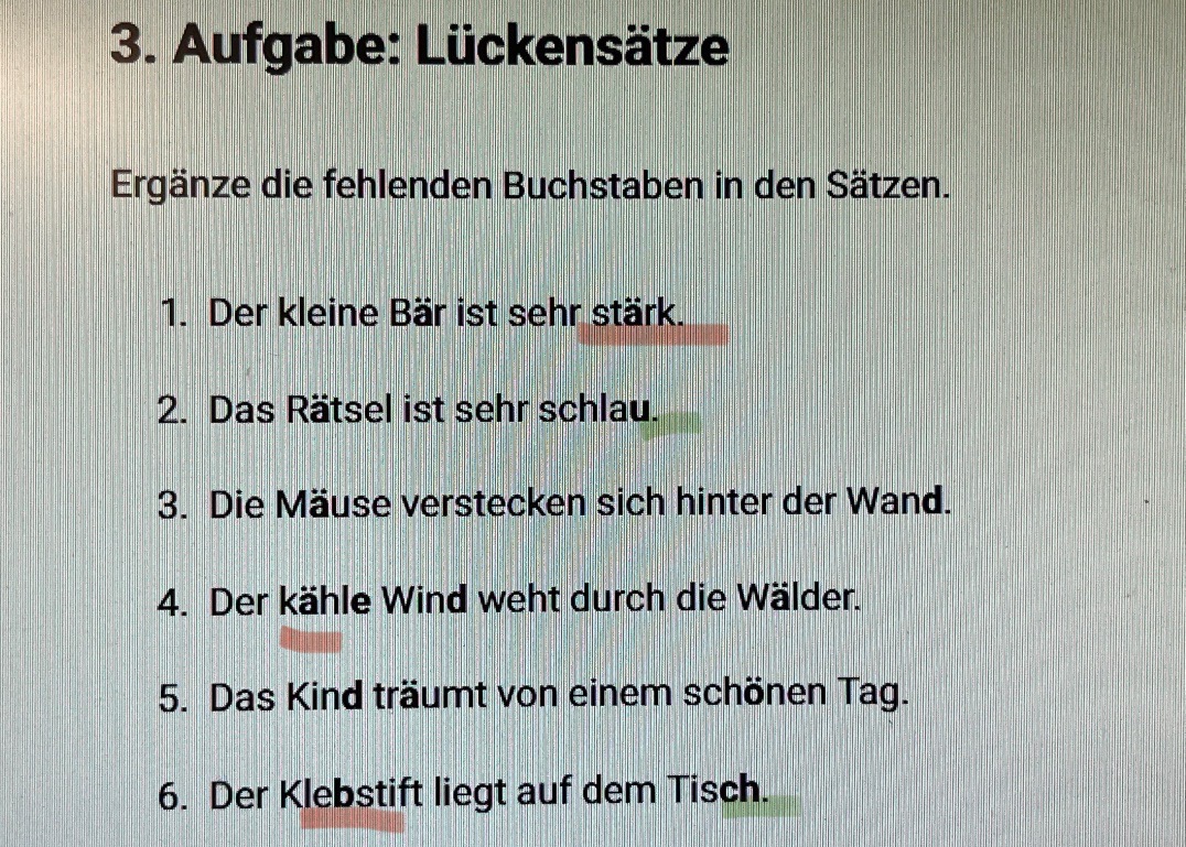 Wieder die Lösung. Die einzusetzenden Buchstaben sind jetzt unterstrichen.