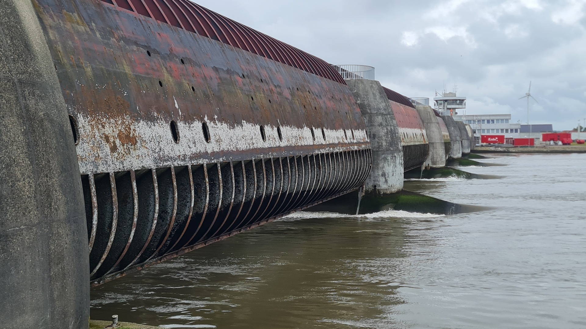 Wieso "gruselig"? Das sind die Tore eines Sperrwerks, die je nach Bedarf hoch- und 'runtergefahren werden. Das Foto zeigt wahrscheinlich das Eidersperrwerk, oder kleiner gruener frosch ?