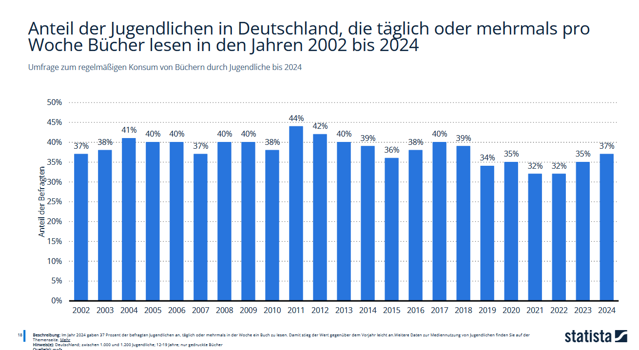 Natürlich lesen wir auch im Englisch-Unterricht Ganzschriften, Artikel aus Zeitungen und Zeitschriften, Kurzgeschichten usw. Und natürlich ist die Vermittlung von "Medienkompetenz" etwas, dass wir in der Schule vermitteln müssen. Aber die Zeiten ändern sich nun mal. Ich schätze, die Zahl der "freiwilligen Leser*innen" wird in den nächsten Jahrzehnten weiter abnehmen.