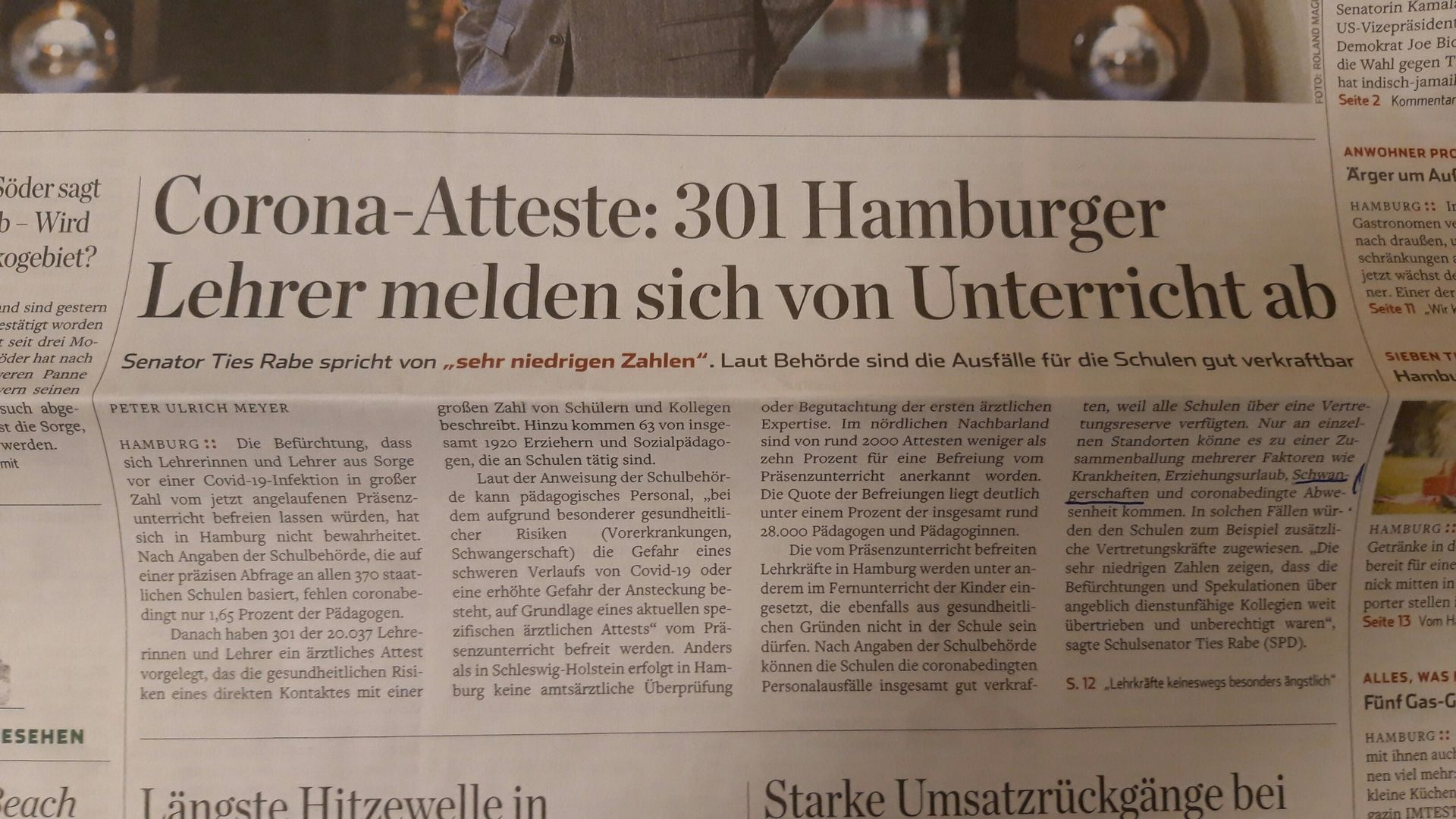 So ist auch mein Eindruck: oberste Priorität - gefühlt mit allen Mitteln - ist die Sicherung des Präsenzunterrichts. Keine Frage dieser ist für die Kinder super wichtig (die Frage ist aber, ob man ihn nicht hätte sicherer gestalten können, sogar die Leopoldina hat das jetzige Modell nicht vorgeschlagen). Wie wichtig der Präsenzunterricht ist und wie LehrerInnen "nur" funktionierende MitarbeiterInnen im System sein sollen: Sieht man nicht nur an uns Schwangeren, sondern auch, dass Schleswig-Holstein nur 10% der Atteste akzeptiert und sich damit über medizinische Erkenntnisse stellt...