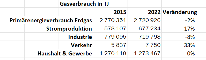Der Gasverbrauch ist im Übrigen seit 2015 im Vergleich zur letzten vorliegenden Energiebilanz von 2022 nur wenig zurückgegangen. Der Verbrauch von Gas in der Stromproduktion, in die wir so viel "investieren", war 2022 sogar höher - trotz der extrem hohen Gaspreise. Deutlich zurückgegangen ist aber der Industrieverbrauch - offensichtlich durch hohe Preise und durch die verzweifelte Lage der produzierenden Industrie insgesamt (nicht wettbewerbsfähige Strompreise, überbordende Bürokratie, keine Fachkräfte = fallender Bildungserfolg).