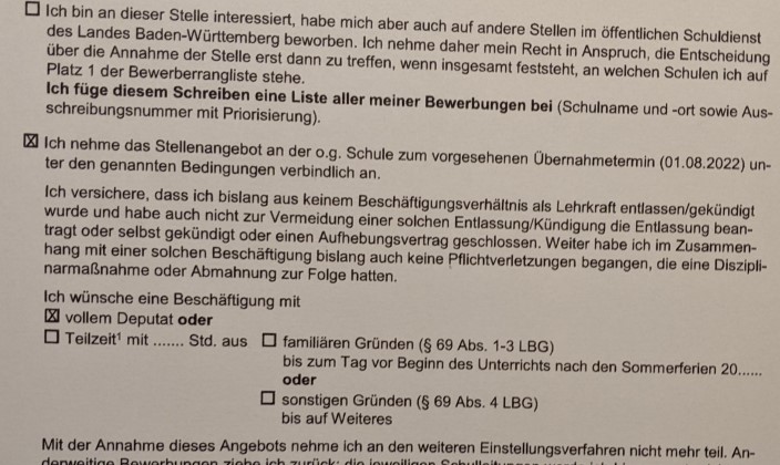 Aber ein freudiges Update: Vor etwa zwei Stunden habe ich die Zusage vom RP für meine Wunschschule zum 01.08.22 bekommen. Die Zusage wurde im Portal hochgeladen, kam also nicht per Post. -
