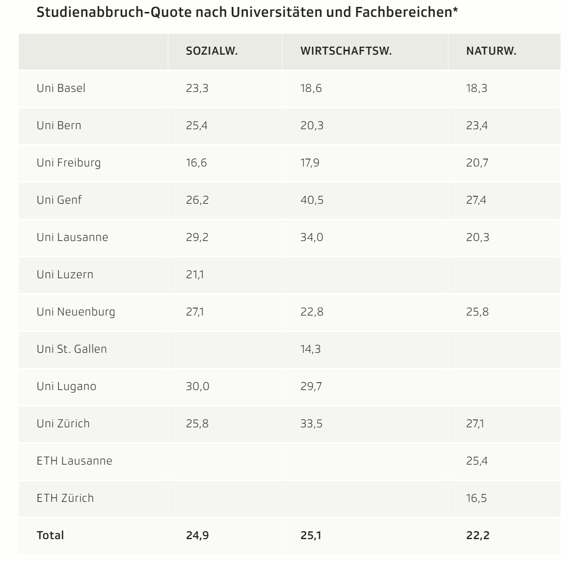 Eigentlich nicht, nein. Wir haben gar keinen NC und gerade Medizin, das einzige Fach mit einem Zulassungstest, hat die geringste Abbruchquote. Das hier ist eine ältere Übersicht, die mal vom SRF zusammengestellt wurde: