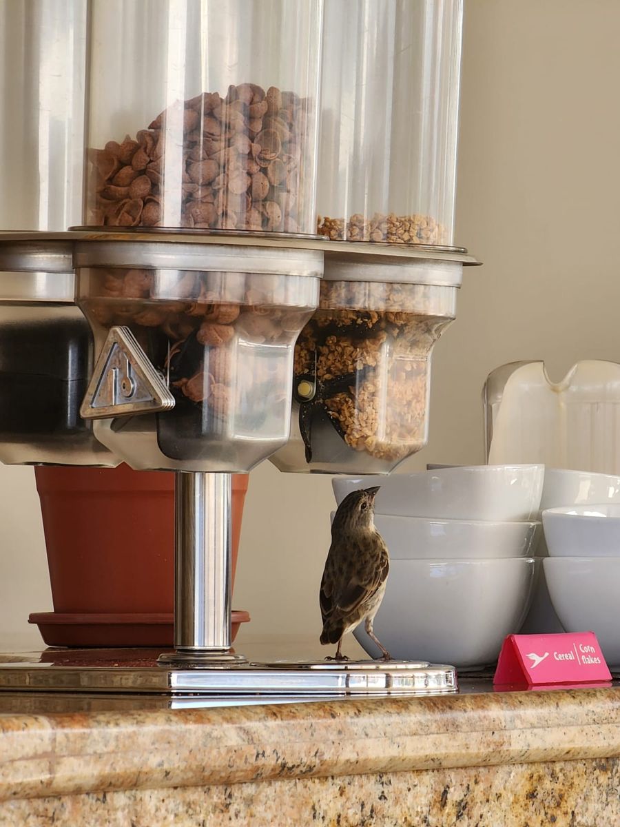 Das kam gerade von jemandem aus der Reisegruppe, der noch länger auf den Inseln geblieben ist. Ein Darwinfink zündet die nächste Evolutionsstufe, er mutiert gerade zum Müslifink. Das Hinterhältige bei diesen Tieren ist, die wissen alle ganz genau, dass ihnen niemand was tut. Ich meine, Kühe auf der Alm sind ja schon frech, aber auf Galápagos existiert sowas wie "Angst" bei Tieren schlichtweg nicht.