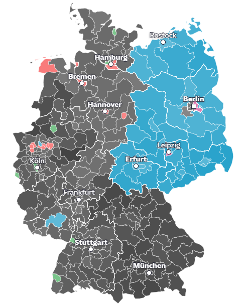 Was die Einfärbung nicht erklärt. Vielleicht liegt es daran, dass die AfD sich im Osten als SED 2.0 geriert.
