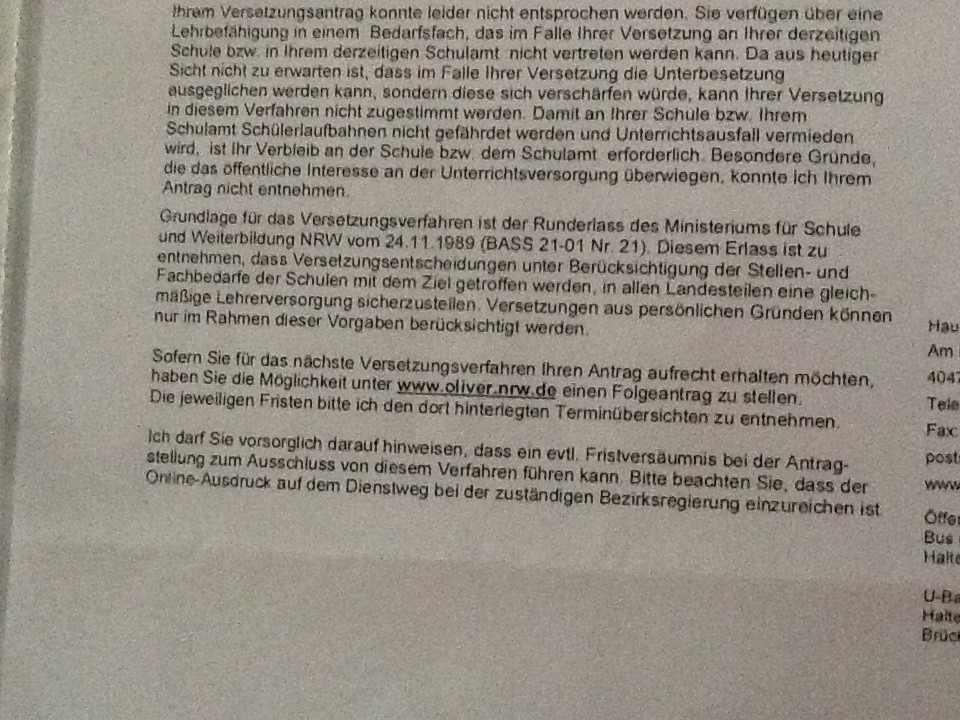 + April 2012 1. Antrag auf Versetzung in Wohnortnähe unter Einbeziehung des Personalrates (Kopie des Antrages dort eingereicht). Angabe von Gründen: Fahrzeit von über 70 Minuten. Antragsschluss 15.7., Votum der Schulleitung: zur Kenntnis genommen, Votum Schulamt: Keine Freigabe. Begründung: bei Zustimmung gehe die Bezreg davon aus, dass in dem Schumaltsbezirk ausreichend Lehrer vorhanden sind und somit dort keine mehr hinmüssen!!!!