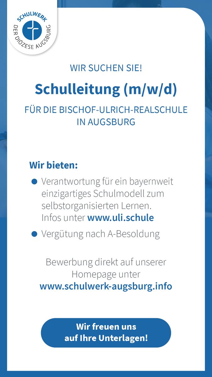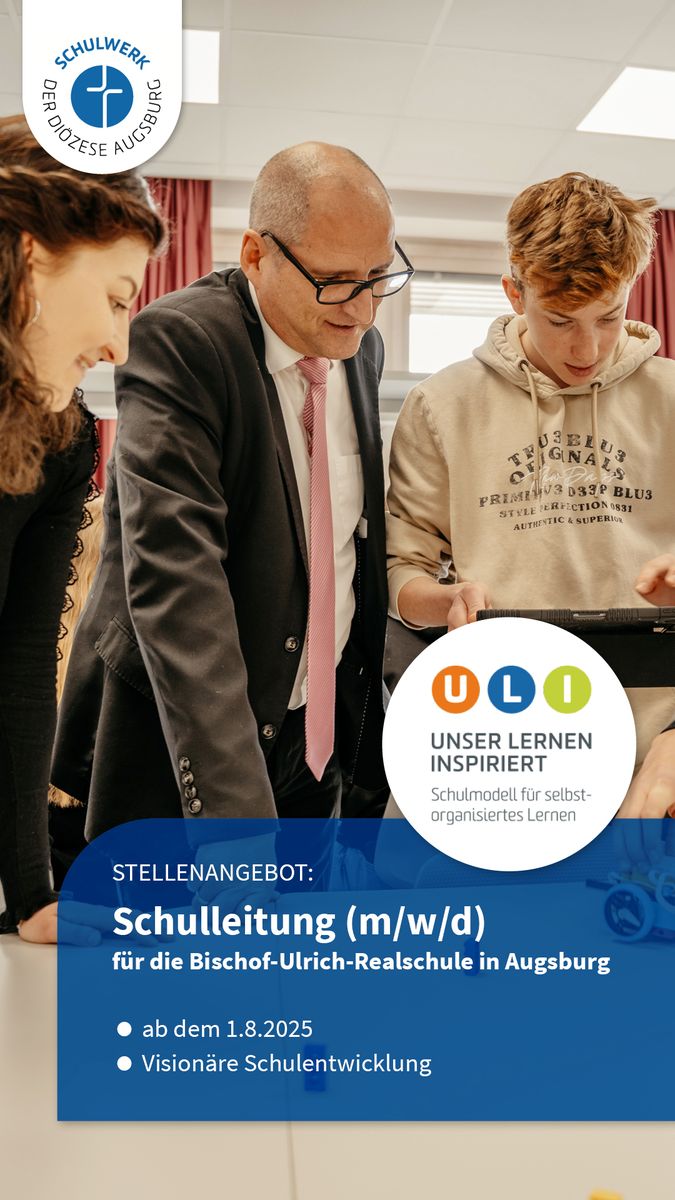 die Bischof-Ulrich-Realschule in Augsburg sucht ab dem 1. August 2025 eine neue Schulleitung (m/w/d). Die Bischof-Ulrich-Realschule ist eine Schule des Schulwerks Augsburg und bietet ein einzigartiges Schulmodell zum selbstorganisierten Lernen. Schaut euch gerne das Stellenangebot auf der Website http://www.schulwerk-augsburg.info an! oder sendet eine Bewerbung an peter.kosak@schulwerk-augsburg.de. ![]()