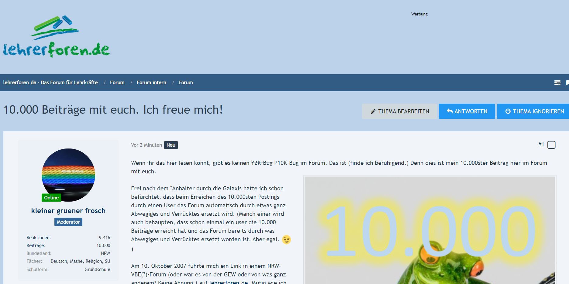 Wenn ihr das hier lesen könnt, gibt es keinen Y2K-Bug P10K-Bug im Forum. Das ist (finde ich) beruhigend. Denn dies ist mein 10.000ster Beitrag hier im Forum mit euch.