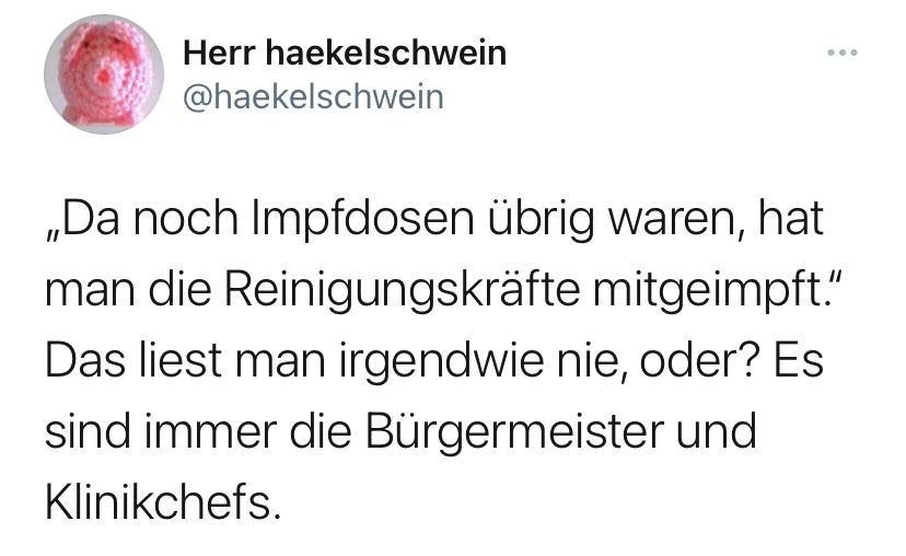 Ich finde so eine Diskussion nicht zielführend und neidgeprägt. Wenn eine übriggebliebene Impfdosis jemandem mit niedrigerer Priorität verabreicht wird, tut das keinem weh, und ändert nichts daran, dass die Regelimpfungen an Menschen mit Risikofaktoren vergeben werden. Wir dürfen jetzt nicht dazu tendieren, jeden dieser Fälle zu verurteilen, da es sonst dazu führen wird, dass die übriggebliebenen Impfdosen aus Angst vor falscher Verteilung direkt entsorgt werden. Lieber gar keiner als die Falschen? Autsch, Leute, autsch!