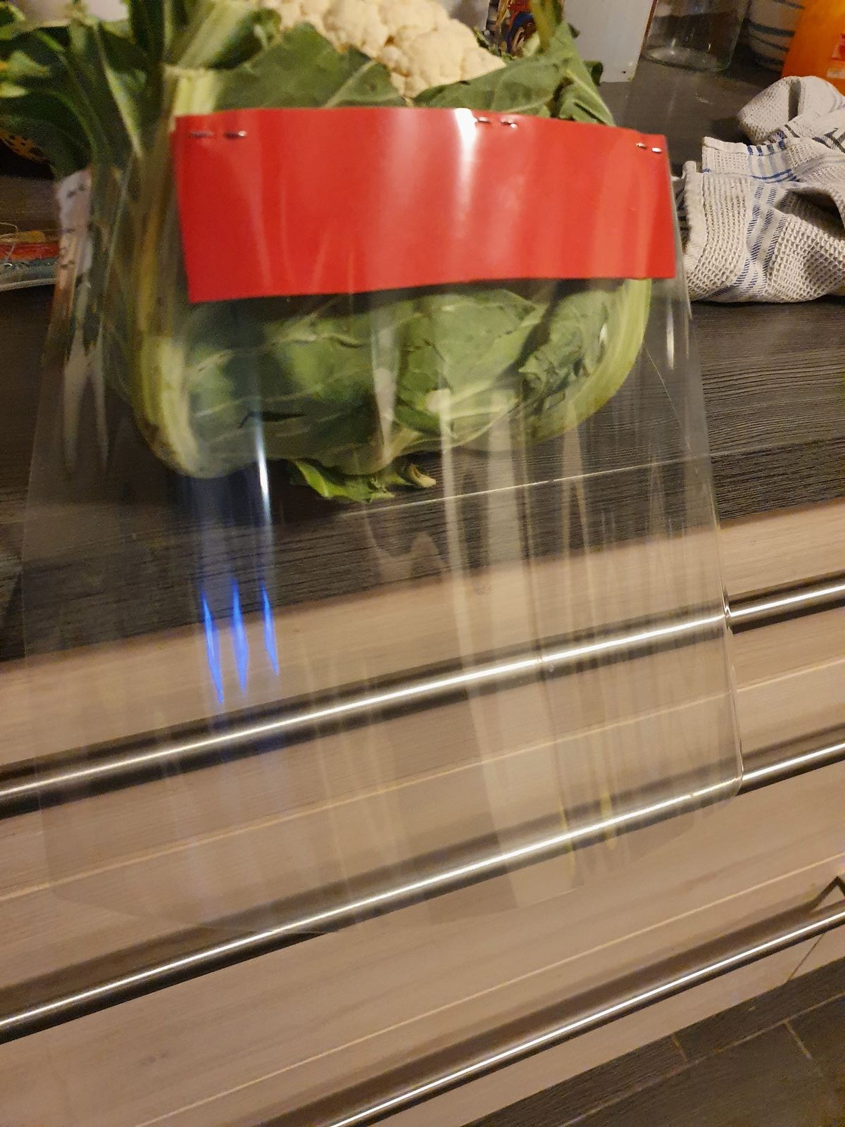 Ich habe heute ein Visier gebastelt. Hier getragen von meinem Blumenkohl. *lach*