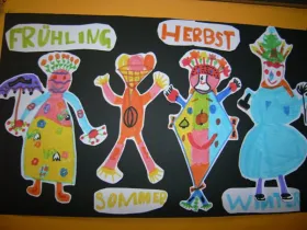 Mein Vorschlag ist zwar nicht sehr kreativ, aber vielleicht passt er ja für deine Schüler: A3 Zeichenblatt falten (Längsseite) - öffnen - falten (Breitseite) - war für manche gar nicht so leicht. Anschließend in jedes der 4 Felder ein Bild passend zur Jahreszeit malen, z. B. Frühling: Blumen, Osterhase,... und event. Jahreszeit darüber schreiben.Folgendes Bild habe ich einmal mit einer (sehr begabten) 2. Klasse gemacht. Vielleicht ja für andere eine Anregung.