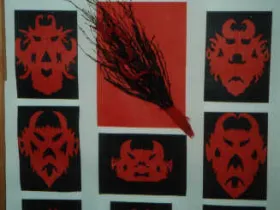 Längs falten und an die Faltkante ein großes, halbes Krampusgesicht malen, ausschneiden und auseinanderfalten. Wenn das Ergebnis dem Kind gefällt dieses Papier als Schablone für das rote Papier (wieder längs falten,...) nehmen. Auf schwarzes Tonpapier kleben.Viel Spaß beim Ausprobieren, Birgit