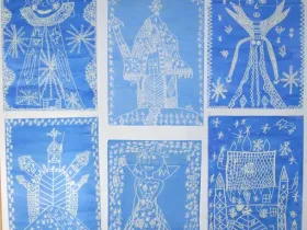 Zur "Schneekönigin" habe ich in einer 4. Klasse eine Tintenlöscher-Radierung gemacht. Das Blatt mit blauer Tinte anmalen und nach dem Trocknen mit dem Tintenlöscher zeichnen. Die Kinder durften zwischen dem Schloss und der Schneekönigin auswählen.