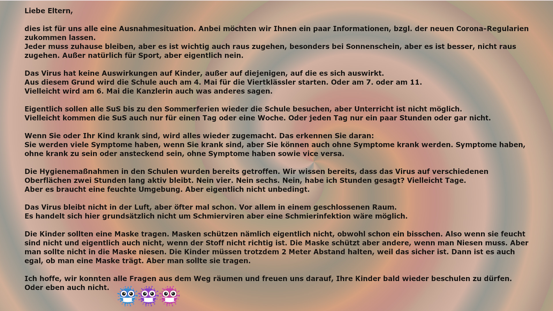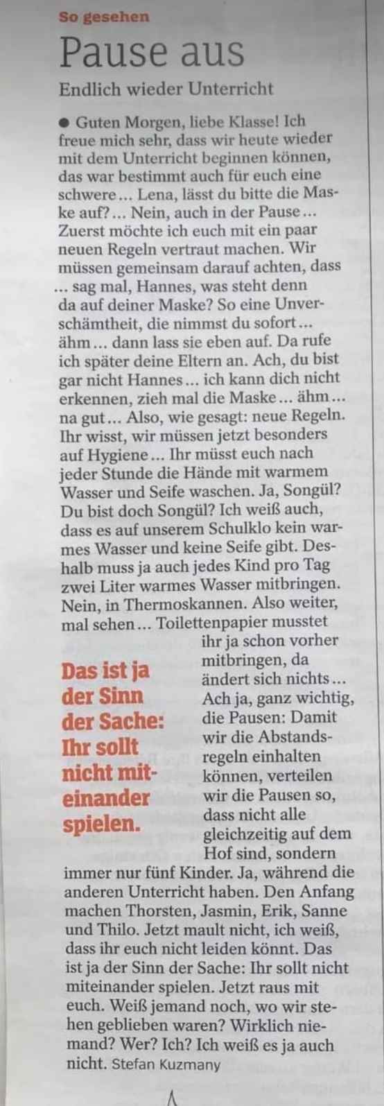 dass es ab Donnerstag Angebote zu den Prüfungsfächern für die Prüflinge geben wird, die von den Schülern freiwillig besucht werden können.Aber in der 14. Schulmail steht nirgends mehr, dass es ab Donnerstag nur ANGEBOTE in den Prüfungsfächern für die 10er/ die Abschlussklassen geben soll, und auch nicht, dass diese von den SuS FREIWILLIG besucht werden können.
