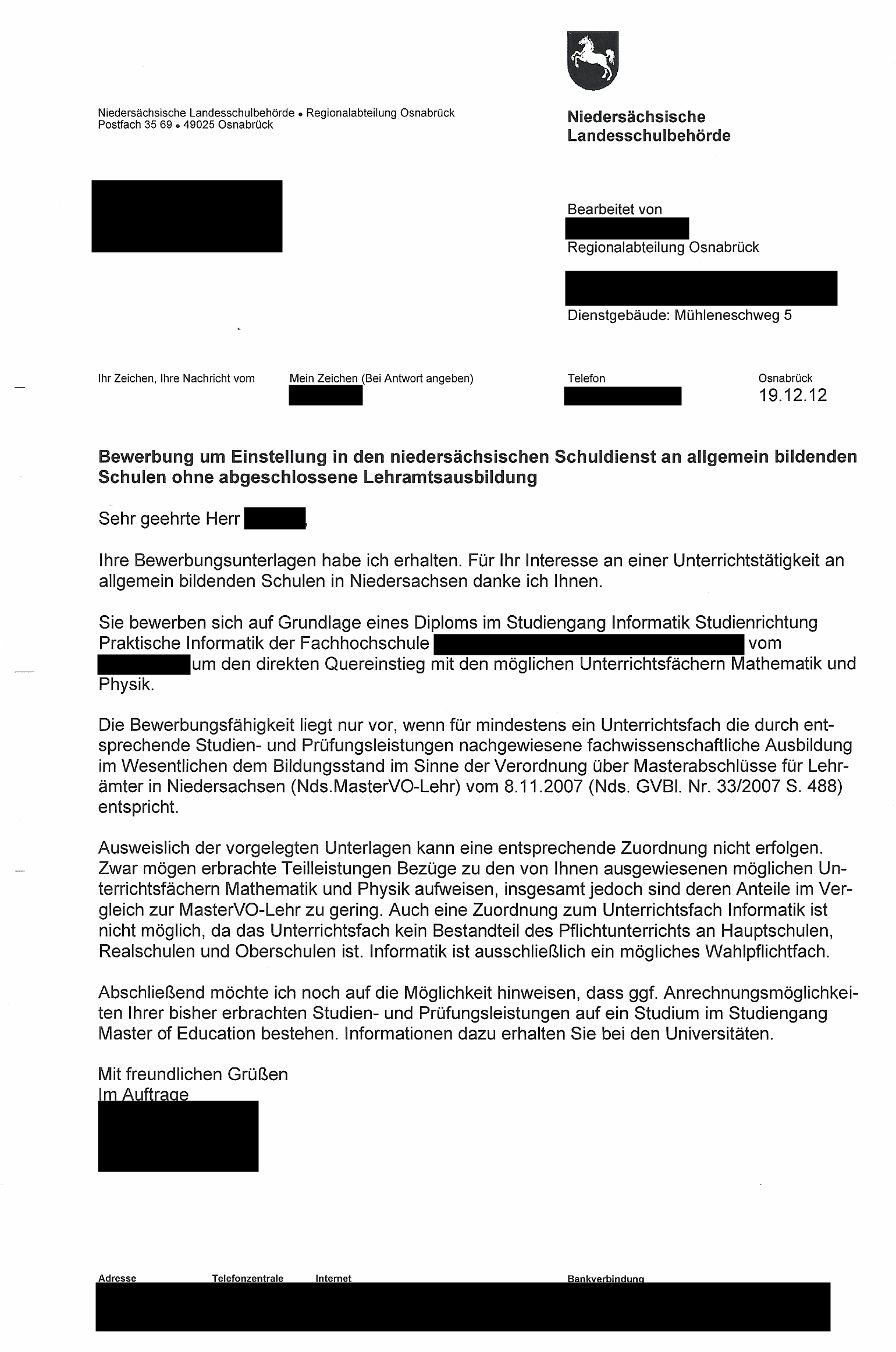 Ich bekam eine Absage mit der Begründung, daß die Anteile in Mathe während meines Studiums zu gering seien.